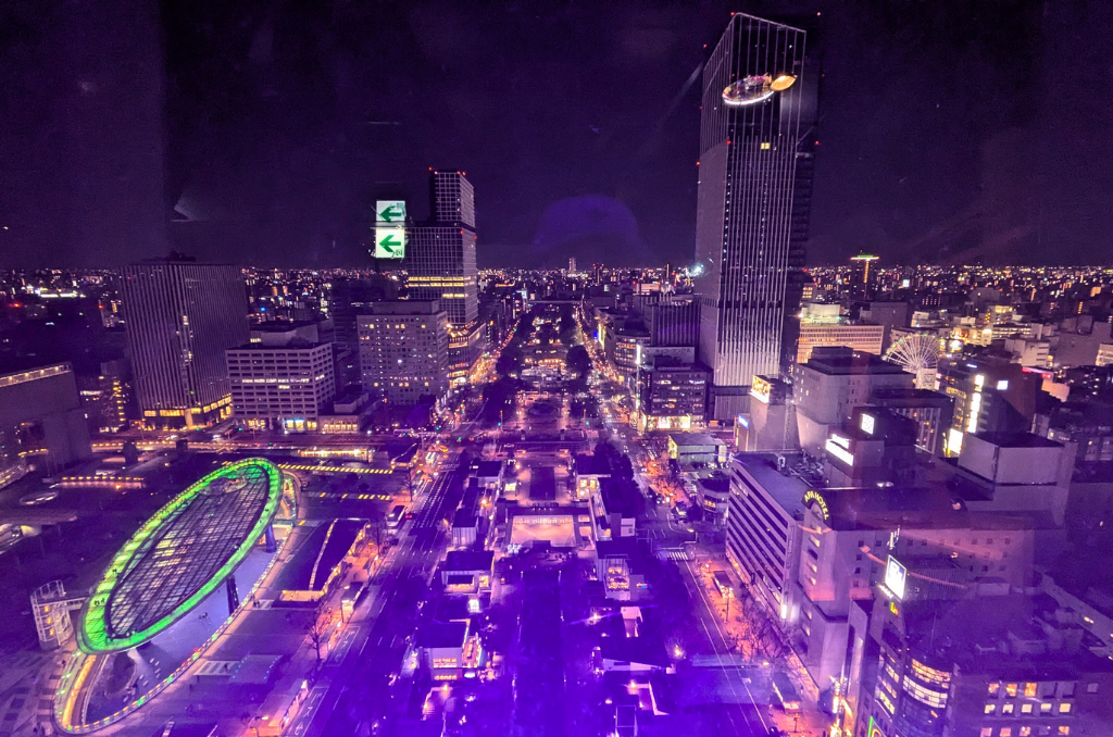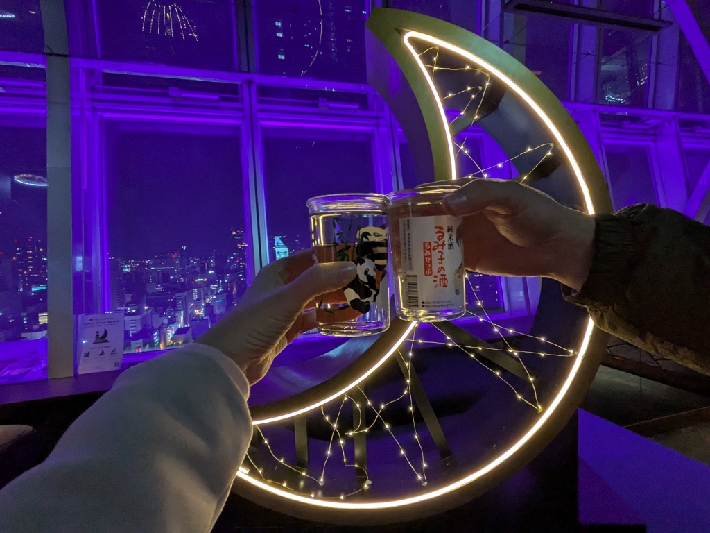 Your night begins at the iconic Mirai TV Tower sky deck, where you’ll toast with your first drink above the city. This spring, the sky deck features sakura projection mapping, giving a wondrous, pink hue to the city views.